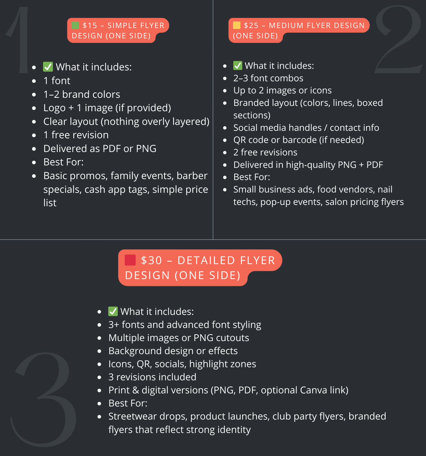 A fully customized, creative flyer with layered graphics, stylized fonts, background textures, cutouts, or promo-style visuals. Perfect for clothing drops, events, or businesses wanting a strong visual presence.