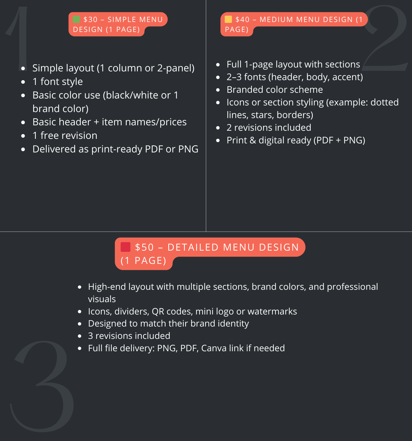 Make your business stand out with a professionally designed 1-page menu that’s clean, bold, and built for your brand. Whether you’re a restaurant, bar, café, or food truck — we create custom menus that are easy to read, eye-catching, and fully tailored to your style.